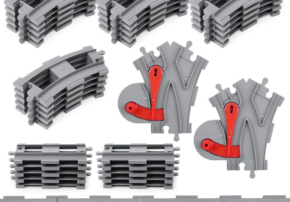 Deze City bouwstenen railset met 32 delen bevat 10 rechte stukken, 2 variabel spoort en 20 gebogen rails. Geschikt voor alle belangrijke treinmerken en perfect om de creativiteit en motorische vaardigheden van kinderen te stimuleren.
